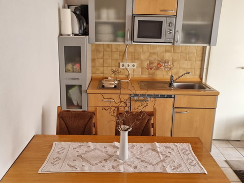 kleine afstand tot het centrum en het bos, kitchenette met kookgelegenheid, vaatwasser en magnetron, TV, radio en telefoon in het appartement