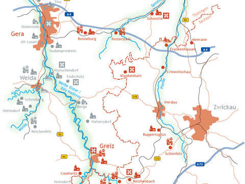 At Blankenhain Castle and Posterstein Castle you will find worthwhile exhibitions before reaching Ronneburg with the castle and the church, and finally the former seat of the Vögte of Gera: Osterstein.